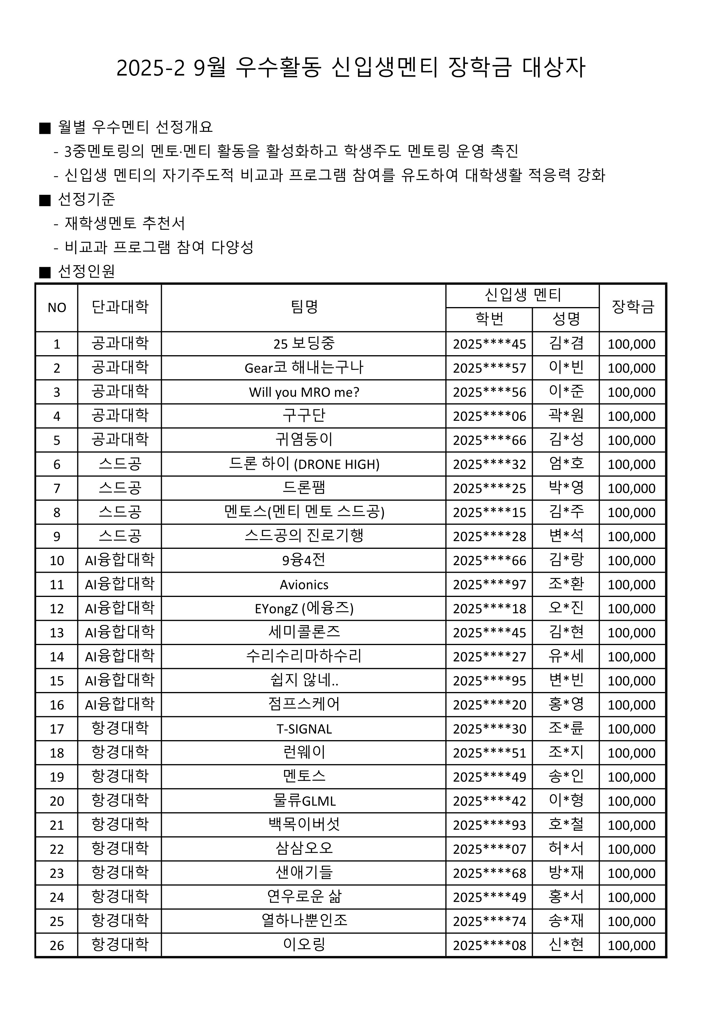 2025-2 9월 우수활동 재학생멘토 장학금 대상자