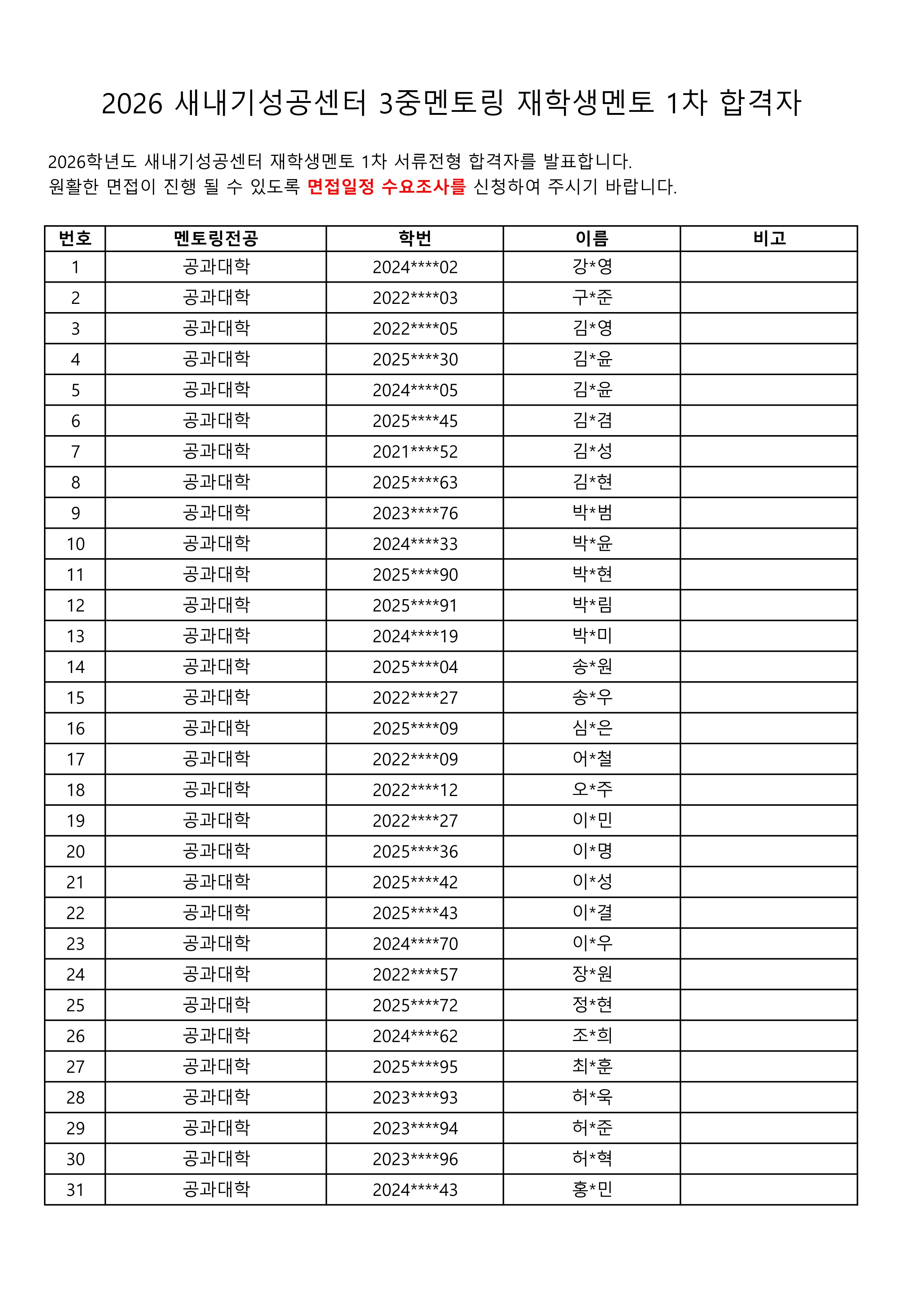 2026 새내기성공센터 3중멘토링 재학생멘토 1차 합격자 안내