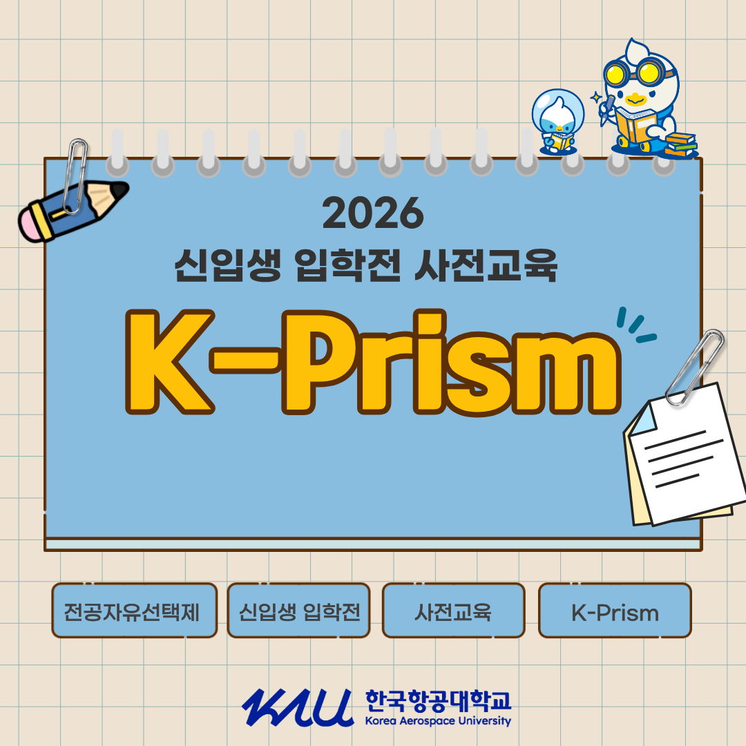 2026학년도 신입생 입학전 사전교육 K-Prism은 전공자유선택제 신입생의 조기 대학생활 적응 및 학습동기 유발과 신입생으로 하여금 진로탐색 및 전공설계를 스스로 계획하고 책임지는 주체가 될 수 있도록 대학생활과 전공의 비전 설계 유도하여 성공적인 대학생활을 성취하기 위한 프로그램입니다.