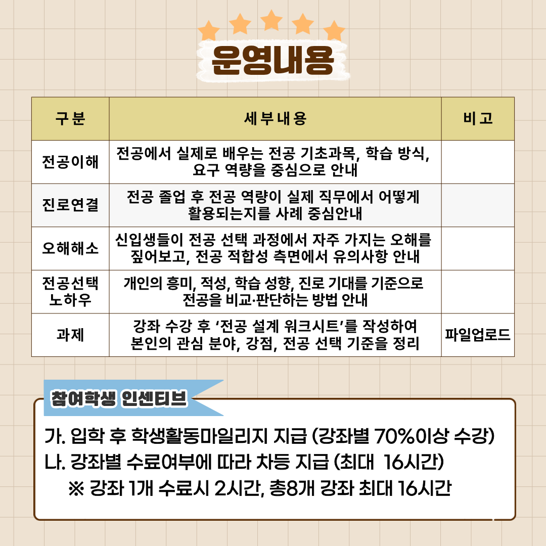 전공이해 | ○ 전공에서 실제로 배우는 전공 기초과목, 학습 방식, 요구 역량을 중심으로 안내 |