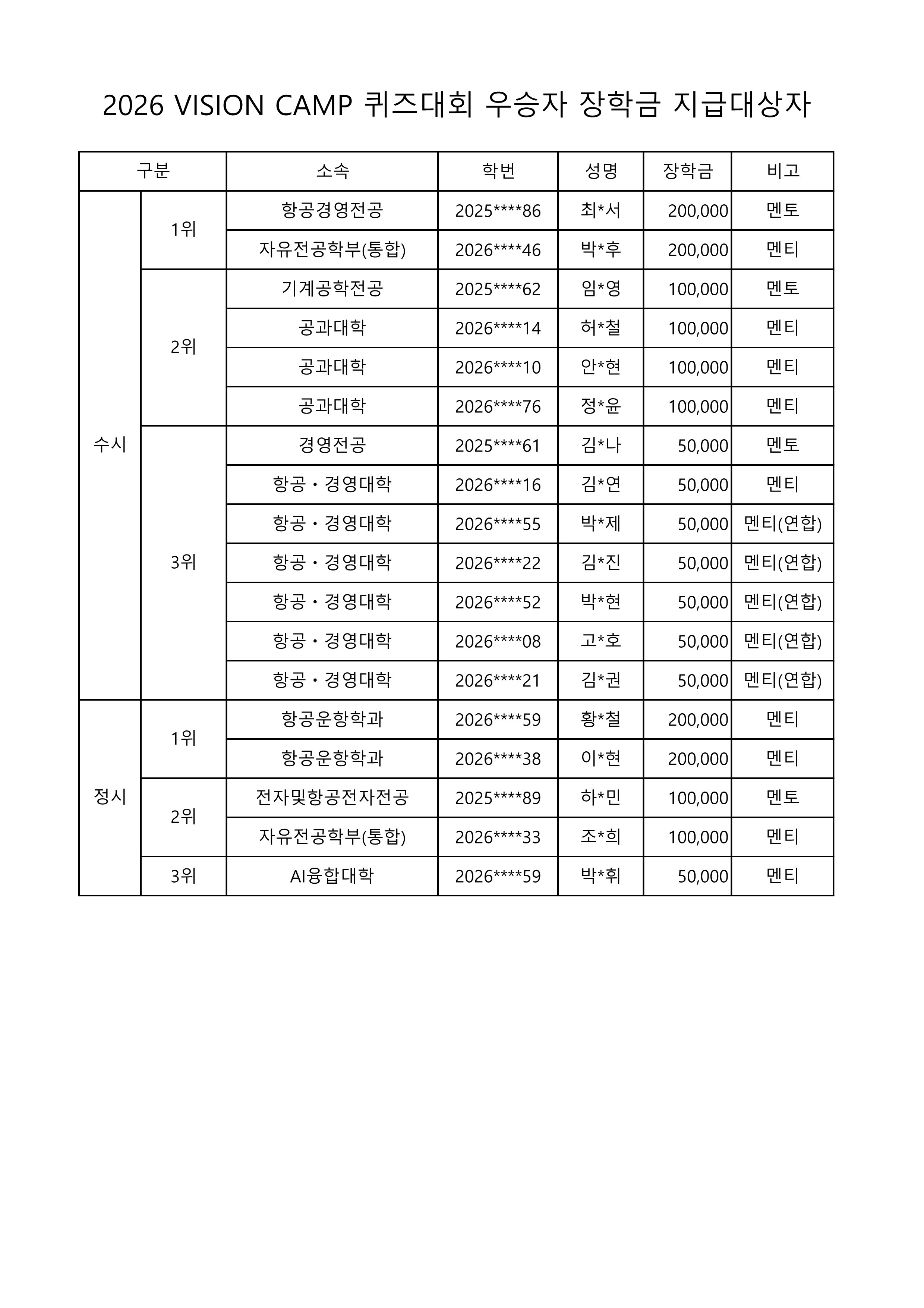 2026 VISION CAMP 퀴즈대회 우승자 장학금 지급대상자 안내