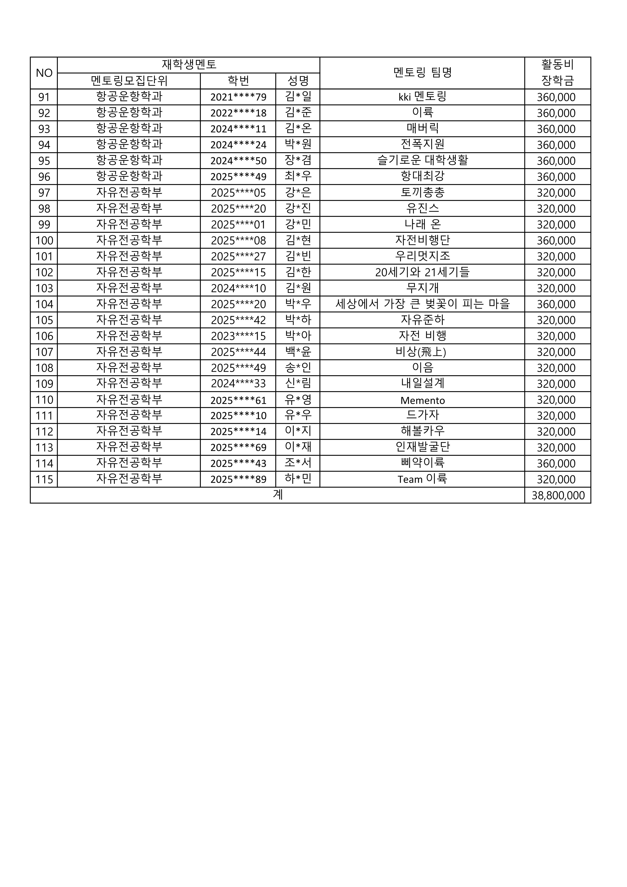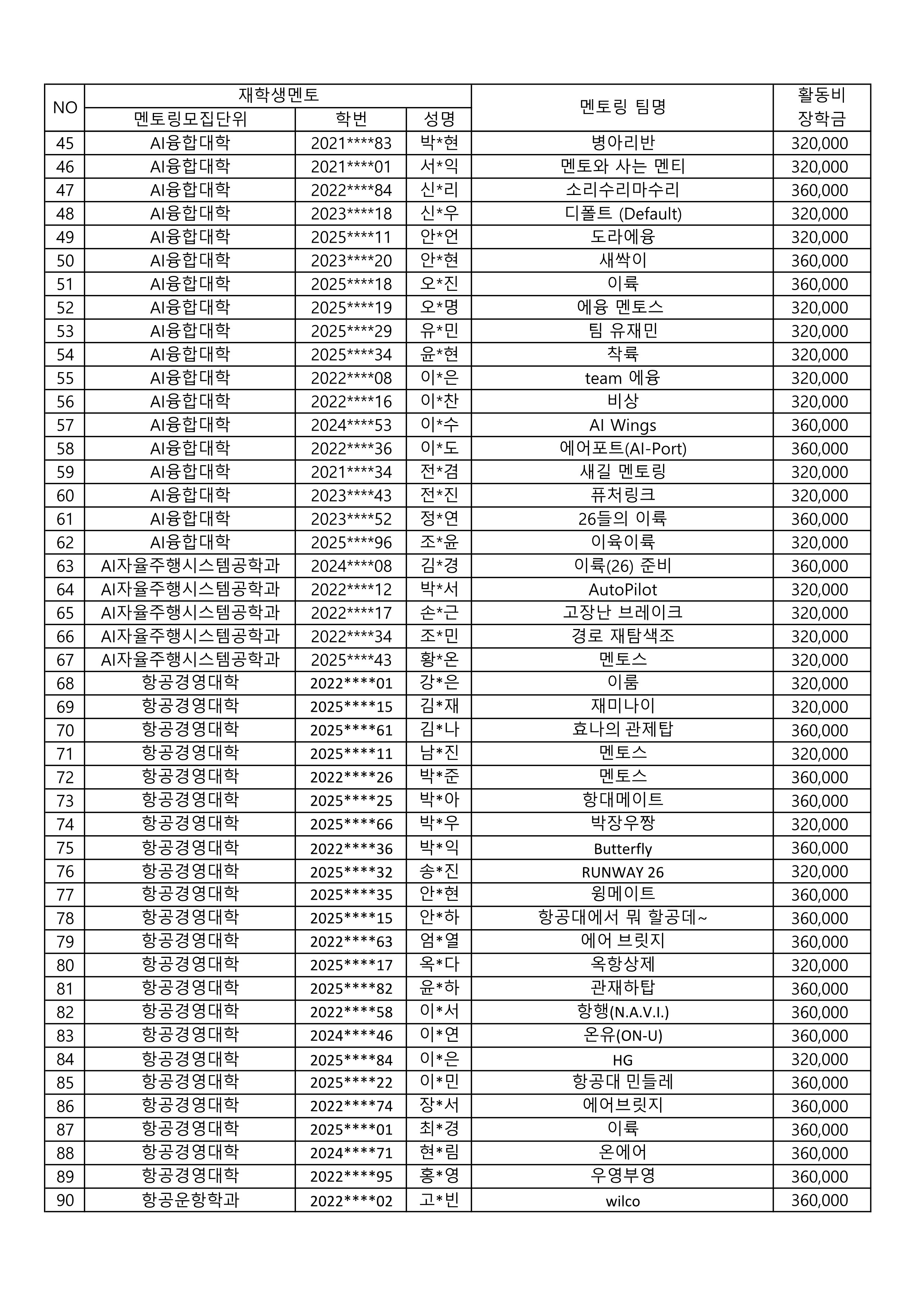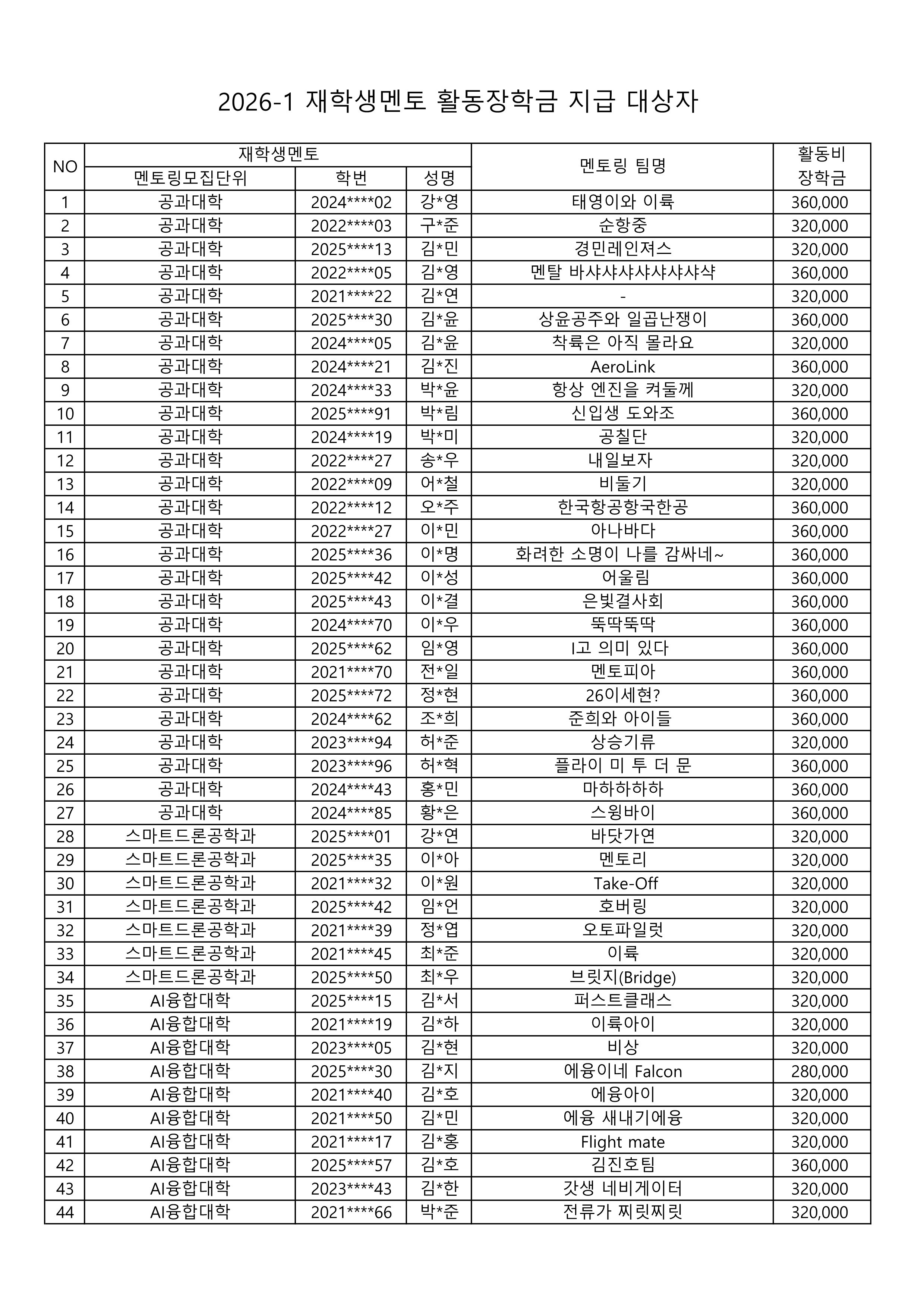 2026-1 재학생멘토 활동장학금 지급 대상자