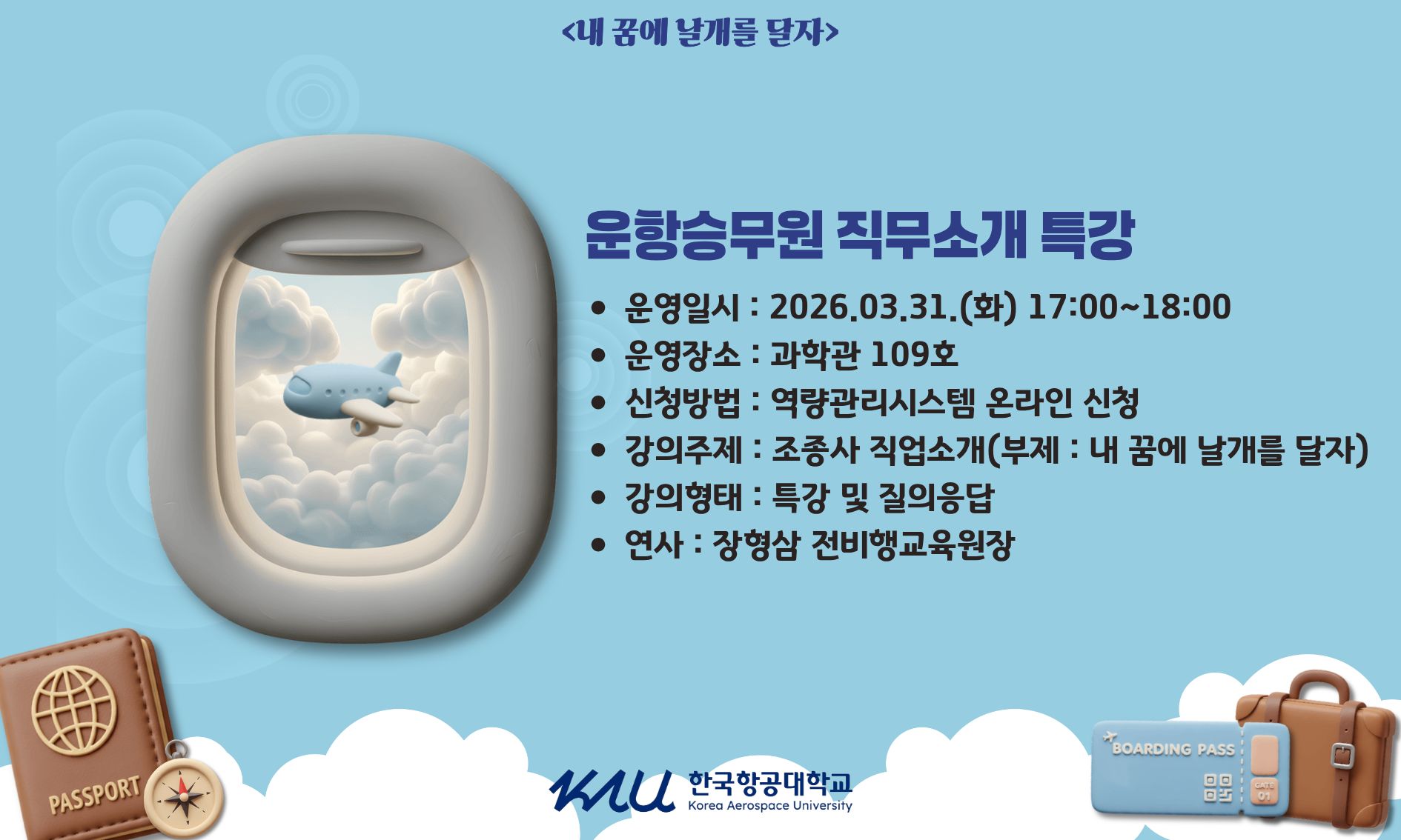 2026 전공자율선택제 신입생 및 재학생을 대상으로 조종사의 실제 진로와 민항 비행 현장을 생생하게 들을 수 있는 운항승무원 직무소개 특강을 운영합니다.