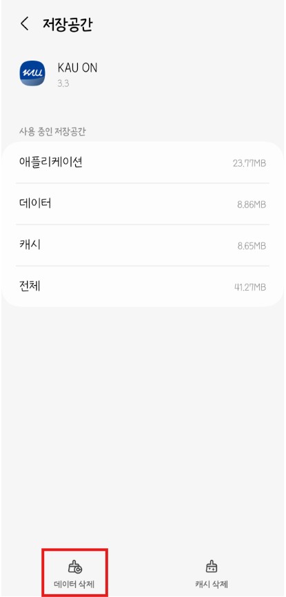 안드로이드 휴대폰 환경에서 해당 문제가 발생하는 경우가 있는데,‘어플리케이션 정보’→‘저장공간’→‘데이터 삭제’후 KAU ON 앱을 재실행하여 권한을 모두 확인하고 전자출결을 다시 시도합니다.