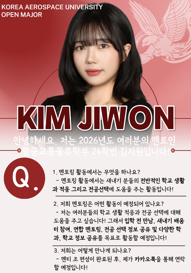안녕하세요, 26학번 새내기 여러분!이번 새내기 멘토를 맡게 된24학번 장승겸입니다.길었던 입시 생활을 마치고 한국항공대학교에 입학하게 된 것을 진심으로 축하드립니다.제 경험을 바탕으로 여러분의 대학 생활에 조금이나마 도움이 되었으면 하는 마음으로 몇 가지 조언을 전하고자 합니다. 1.시간을 잘 활용하자!‘시간을 잘 활용하자’라는 말이 다소 무겁게 느껴질 수 있지만,무작정 공부만 하라는 의미는 아닙니다 ㅎㅎ.저는 지난 학교생활을 돌아보며 시간을 충분히 활용하지 못했던 점이 아쉬움으로 남았습니다.당시에는 남는 시간이 많다고 느꼈지만,막상 돌아보니 특별히 이뤄 놓은 것도,그렇다고 동기들과 열심히 놀며 추억을 많이 쌓은 것도 아니었던 것 같습니다.학년이 올라갈수록 전공 공부는 점점 어려워지고,준비해야 할 것들도 많아지면서 자연스럽게 여유 시간이 줄어듭니다.반면1학년은 비교적 시간이 넉넉한 시기이기 때문에,이 시간을 어떻게 쓰느냐가 정말 중요하다고 생각합니다.남는 시간에 미리 자격증이나 영어 공부를 해도 좋고,동기들과 어울리며 잊지 못할 추억을 만드는 것도 좋습니다.혹은 평소 해보고 싶었던 개인적인 도전에 시간을 써보는 것도 의미 있는 선택이 될 수 있습니다.나중에 뒤돌아보았을 때‘그래도 시간을 알차게 보냈다’고 느낄 수 있기를 바랍니다. 2.선배들과 친해지자!대학교는 이전과는 전혀 다른 환경이기 때문에,처음에는 사소한 것부터 막막하게 느껴질 수 있습니다.그럴 때는 부담 갖지 말고 선배들에게 편하게 질문해 보세요!대부분의 선배들은 기꺼이,그리고 친절하게 알려주실 겁니다.질문하는 것을 두려워하지 않으셔도 됩니다.특히 조종사가 되는 과정은 외부에 잘 드러나 있지 않고,제도나 환경도 자주 바뀌기 때문에 새내기분들께는 더 어렵게 느껴질 수 있습니다.이런 부분은 선배들에게 물어보는 것이 가장 현실적이고 도움이 되는 방법이라고 생각합니다.진로를 고민하는 과정에서 선배들의 조언은 큰 힘이 될 것입니다. 부족하지만 제 경험을 바탕으로 한 조언이 여러분의 대학 생활에 조금이나마 도움이 되었기를 바랍니다.앞으로 학교에서 건강하고 즐거운 모습으로 만나길 기대하겠습니다!감사합니다.